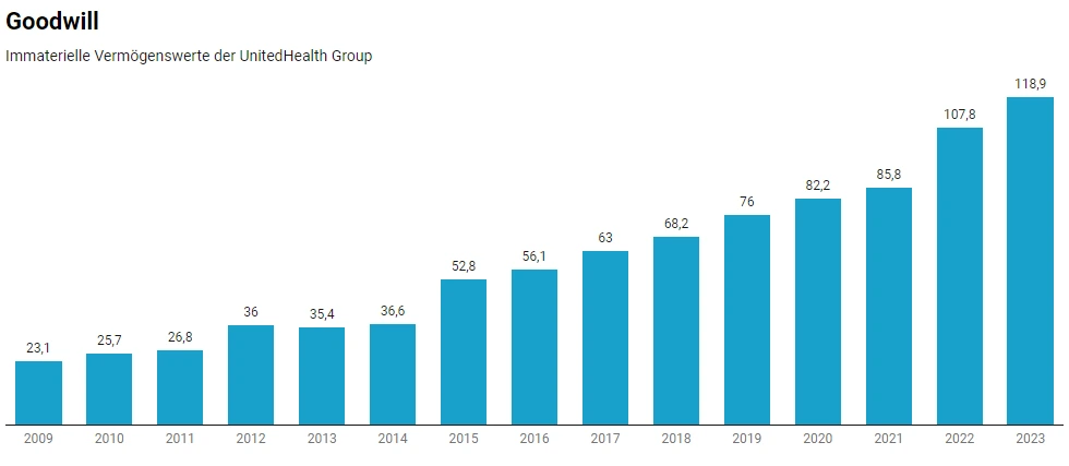 Immaterielle Vermögenswerte und Goodwill: Mit 105,4 Milliarden US-Dollar an Goodwill reflektiert UnitedHealth den Wert von Akquisitionen, die das Geschäft langfristig stärken sollen, während weitere 14,7 Milliarden US-Dollar auf andere immaterielle Vermögenswerte entfallen.